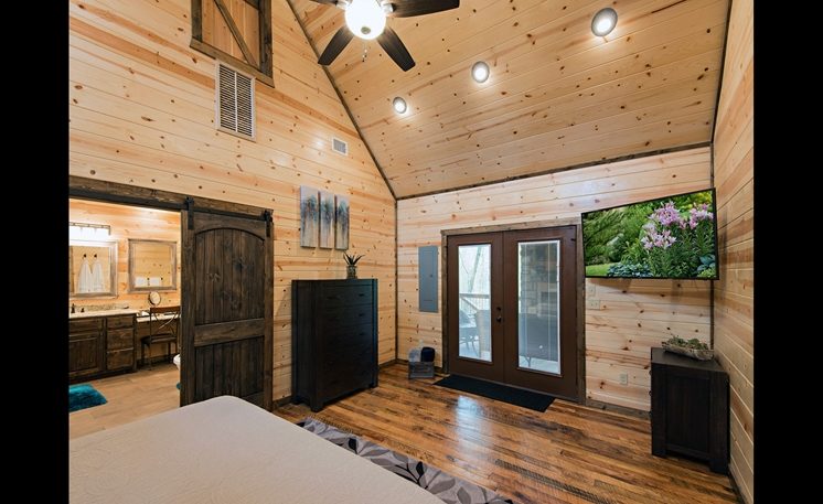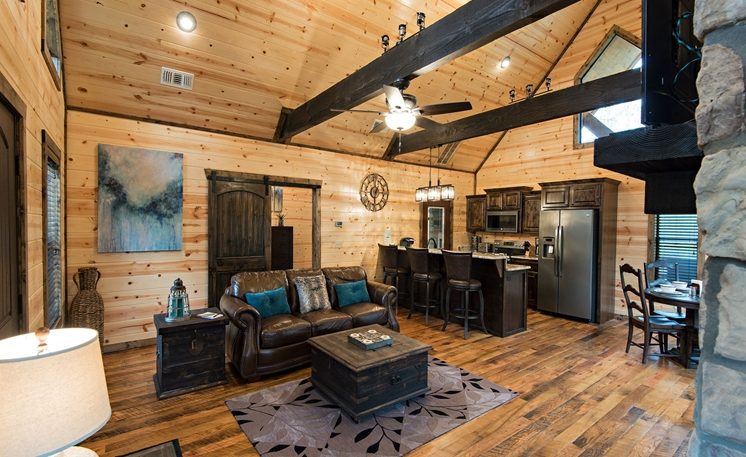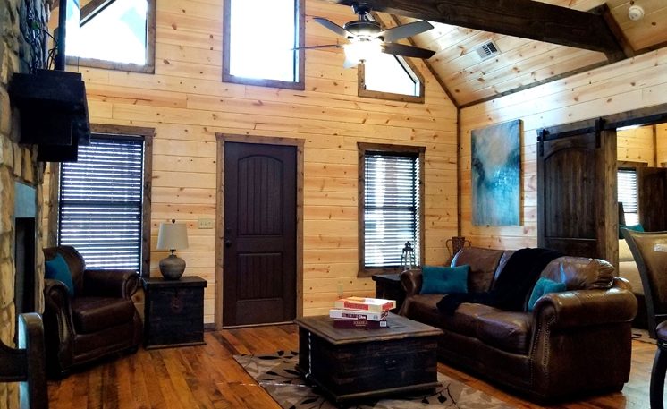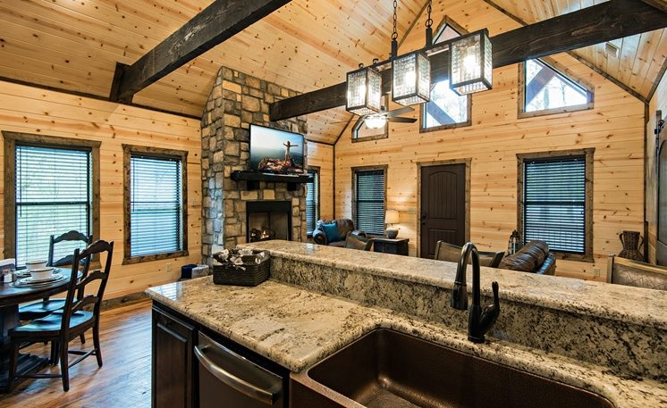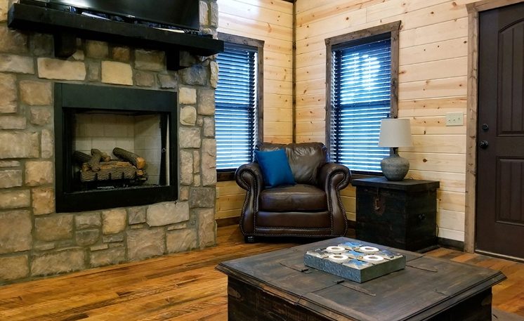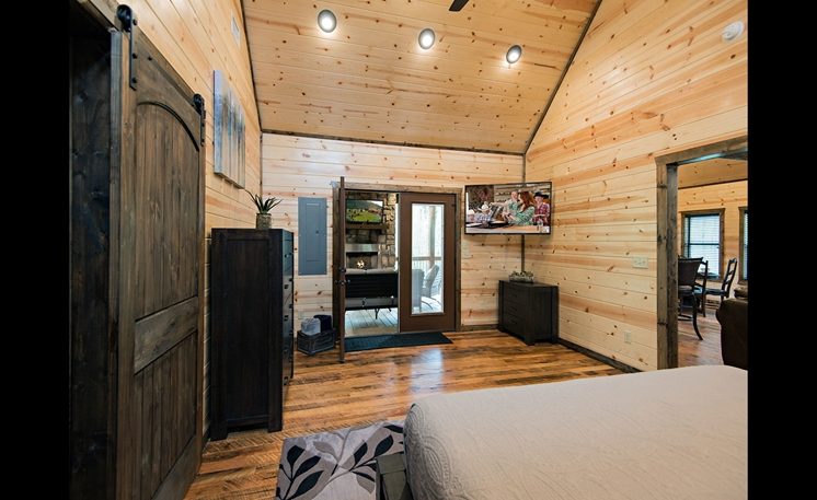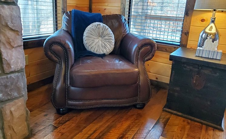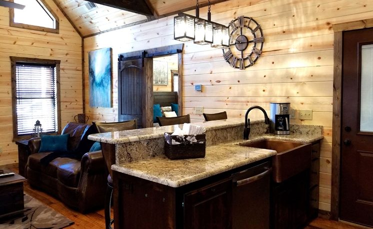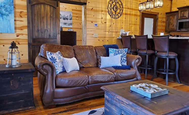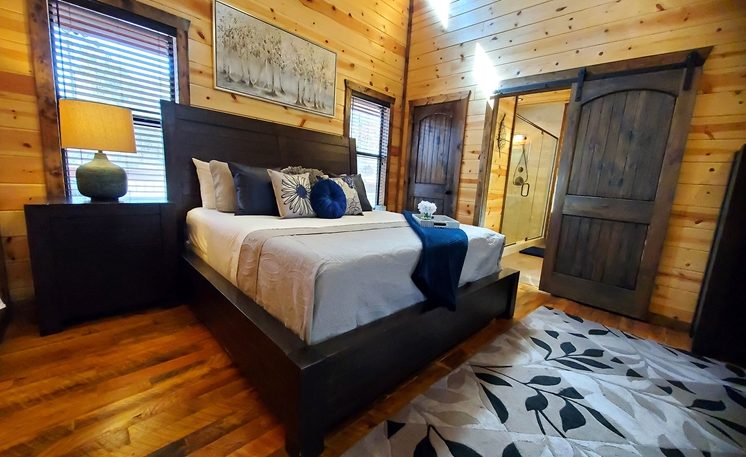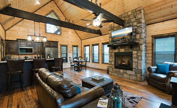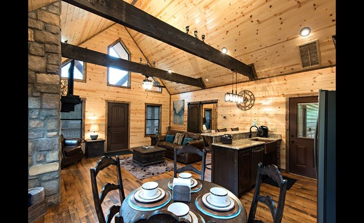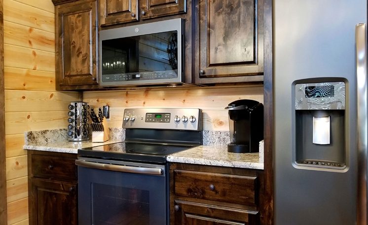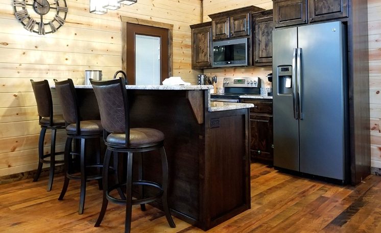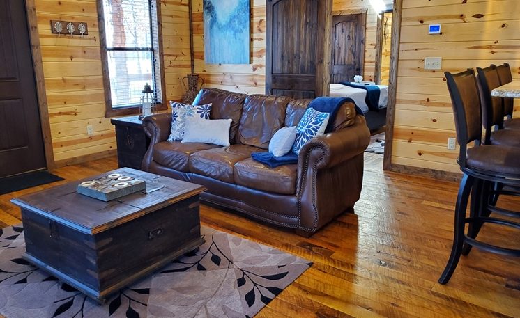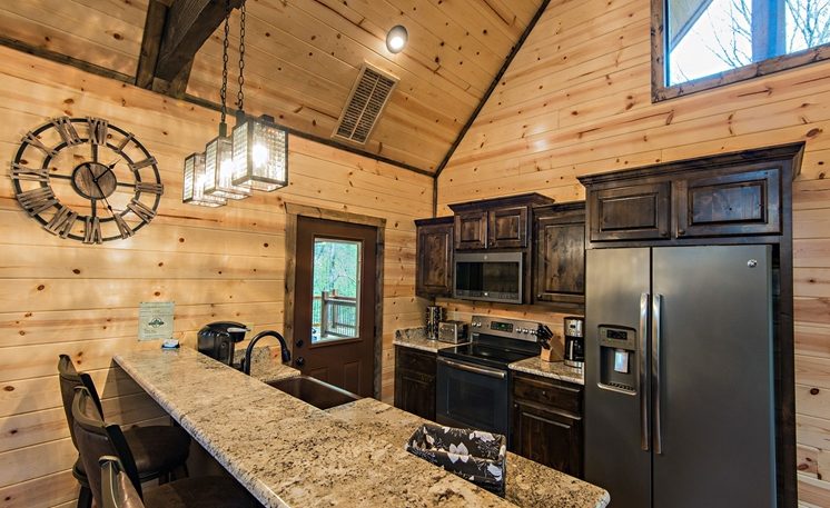 8 Oaks sleeps 2 and offers nicely designed amenities and accessories inside and outside. As you enter, you’ll see the cabin is spacious, yet cozy. The great room has leather furniture and a gas fireplace, and a TV. The adjoining kitchen has a bar area and a 4-person dining table. The fully equipped kitchen features granite counters, and stainless-steel appliances, while the Great Room features a rock fireplace, White Pine interior, and several windows that bring in the scenic outdoors.