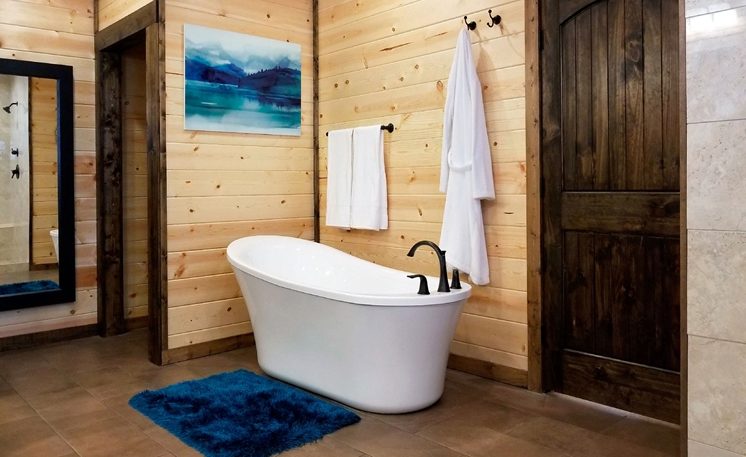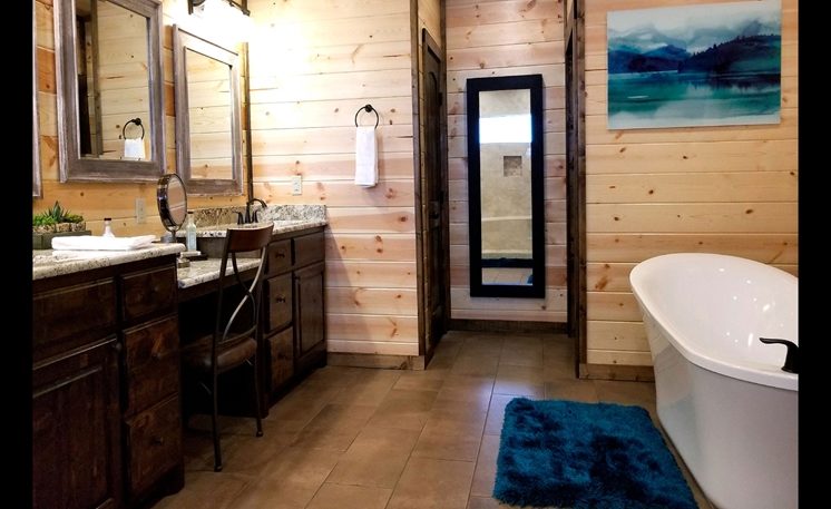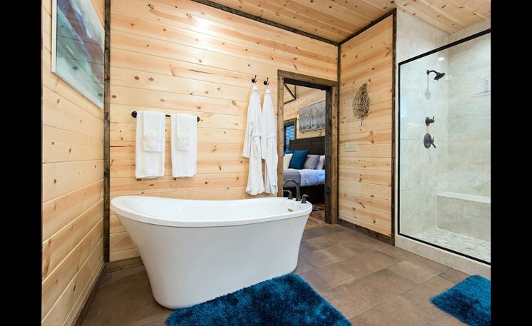 The Master Suite is spacious with a King Bed and 55′ TV. The Master Bath is also spacious with an oversized shower, 2 sinks, a vanity area, and Pedestal Tub. French doors open to a spacious deck with a hot tub, comfortable outdoor furniture, fireplace, TV, and a Bistro table. The deck offers scenic forest and skyline views, including plenty of space to enjoy the hot tub and grilling on the Weber Grill.