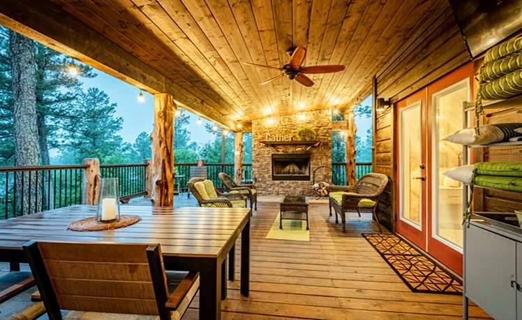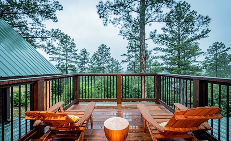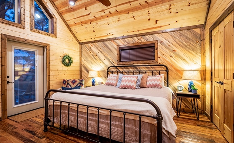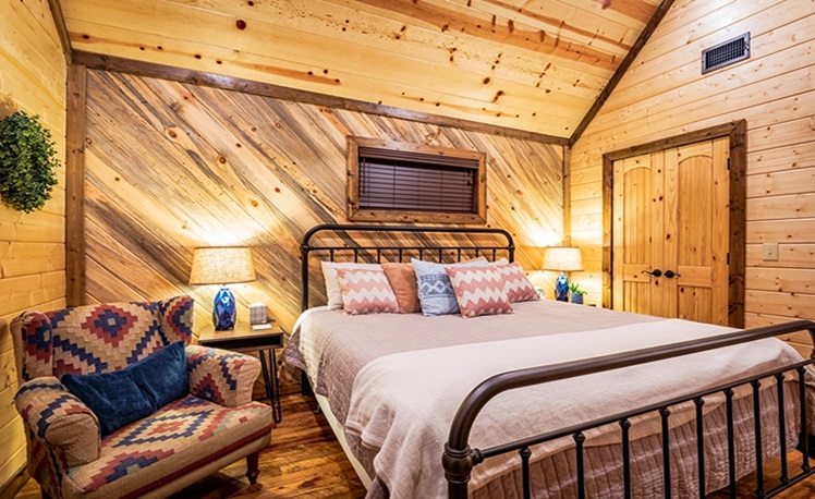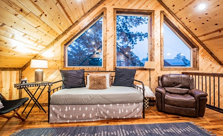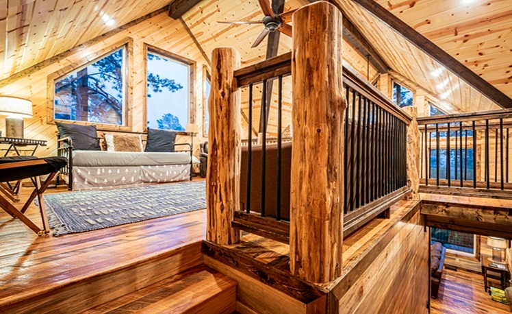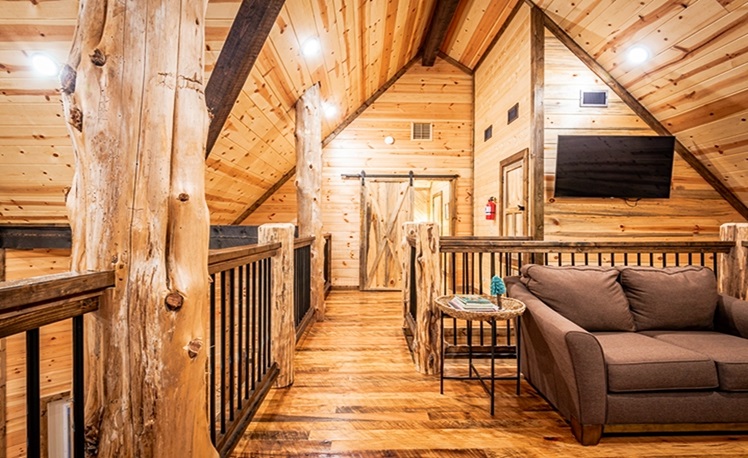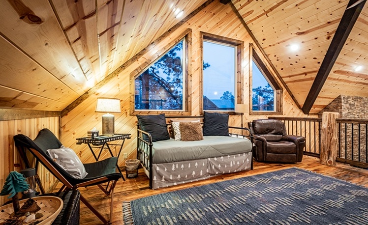 The upstairs balcony is complete with large TV, Arcade Game, Day Bed and Slide-Out Mattress. Great for kids or extra guests. The second floor and balcony provide breathtaking views – ideal for down time after a fun day at Beaver Bend Resort Park.