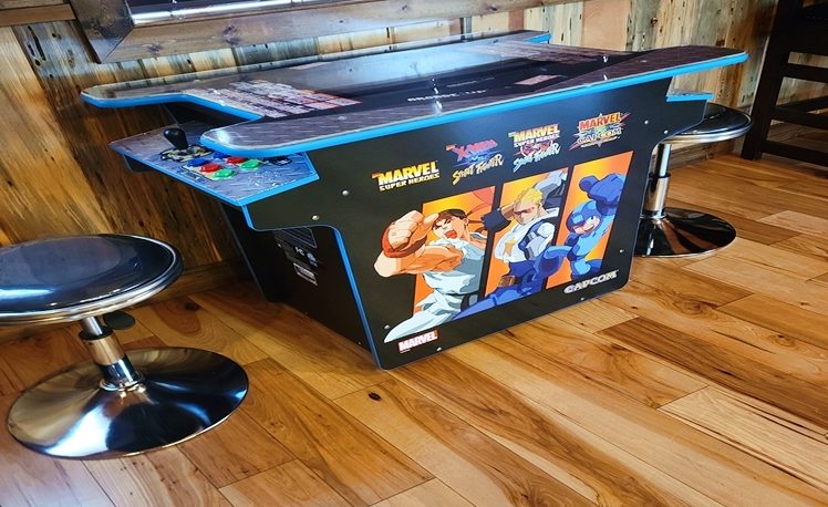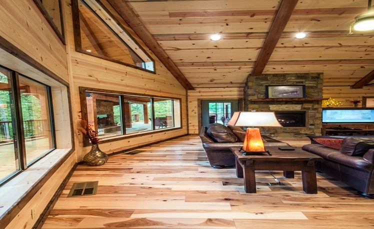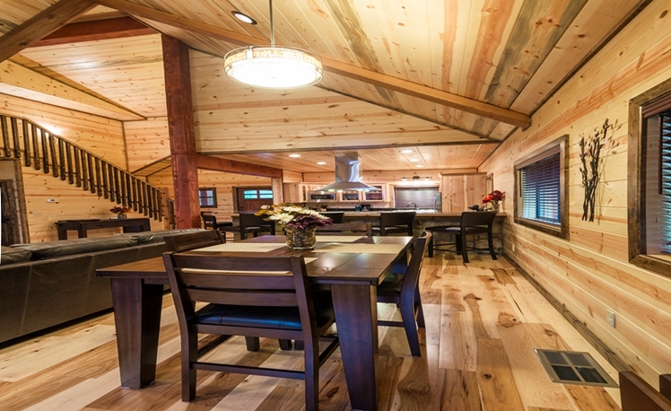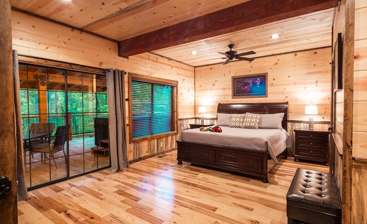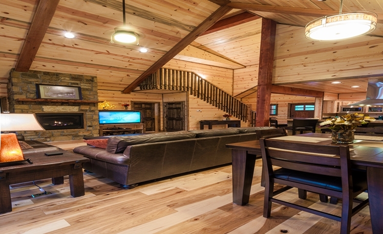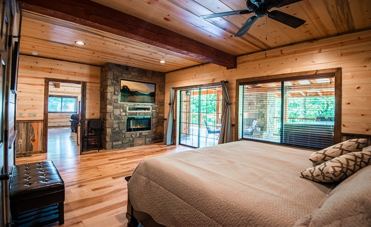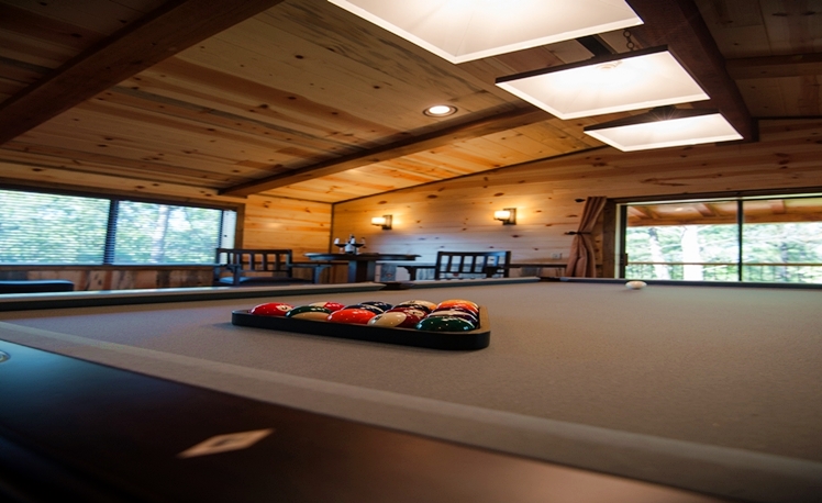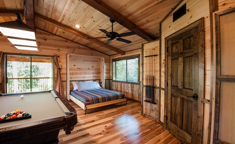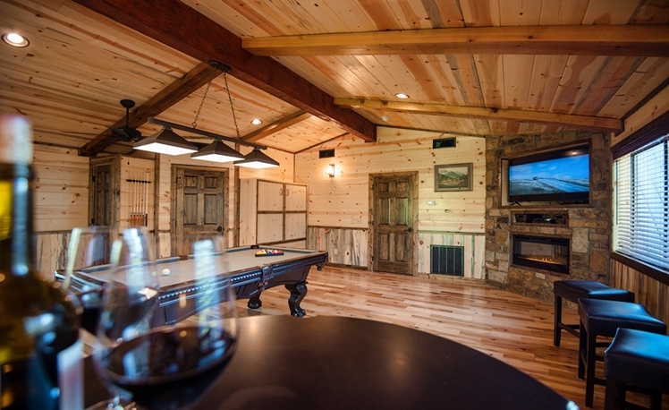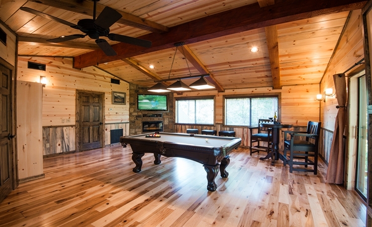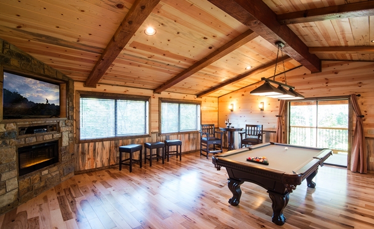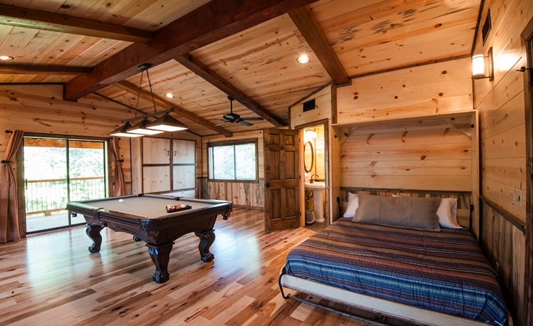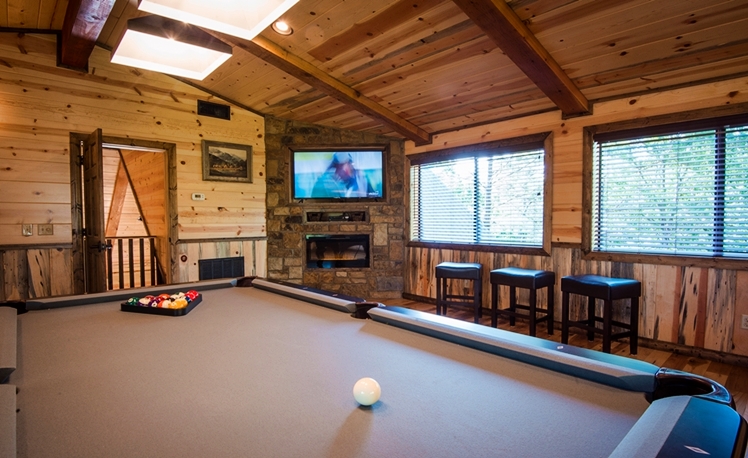The Master Suite includes a king bed, a 55″ TV, rock fireplace, with direct access to the deck. A pool table and 2-person Marvel arcade game are located upstairs in a large game room with fireplace and 55″ TV. Additional sleeping for 4 is accommodated upstairs with 2 queen Murphy beds.