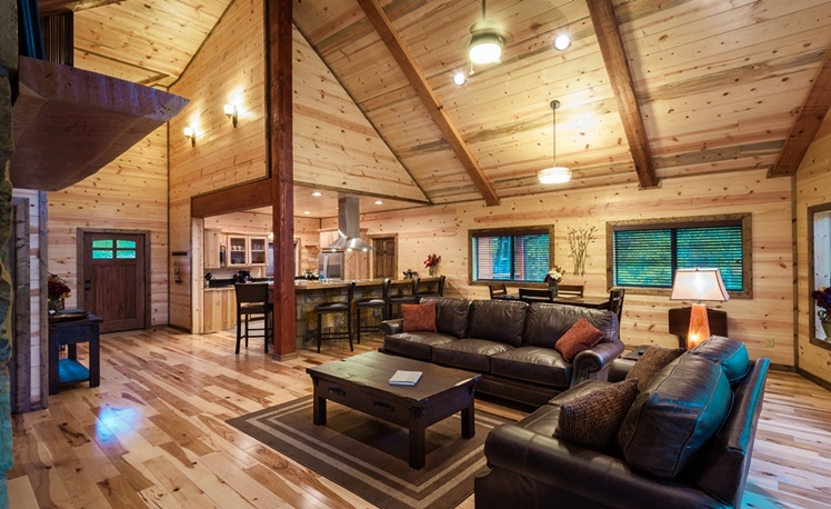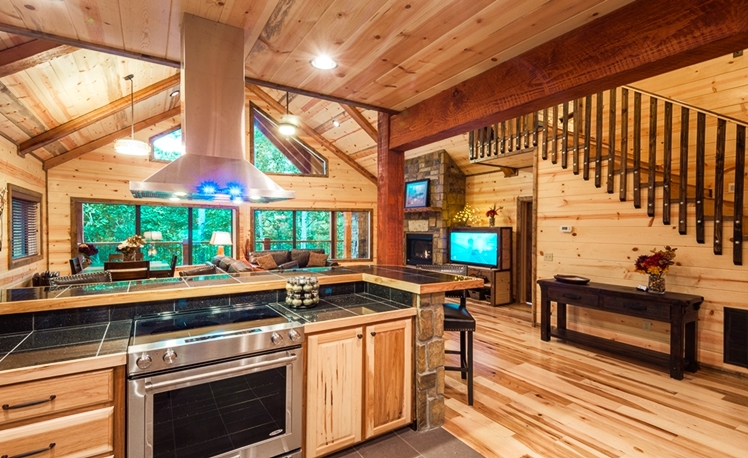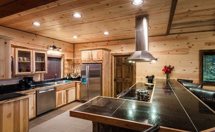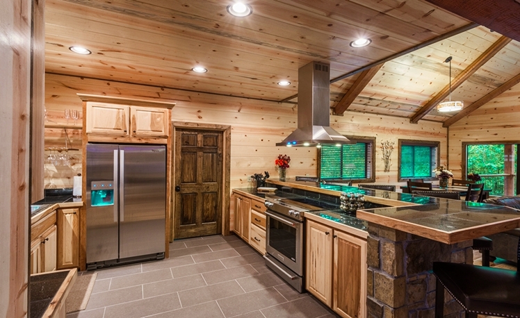 The fully equipped kitchen features granite counters, stainless steel appliances, while the Great Room features a rock fireplace, Douglas Fir beams and white pine interior with blue-stain highlights, and a full wall of windows that showcase the scenic outdoor views.