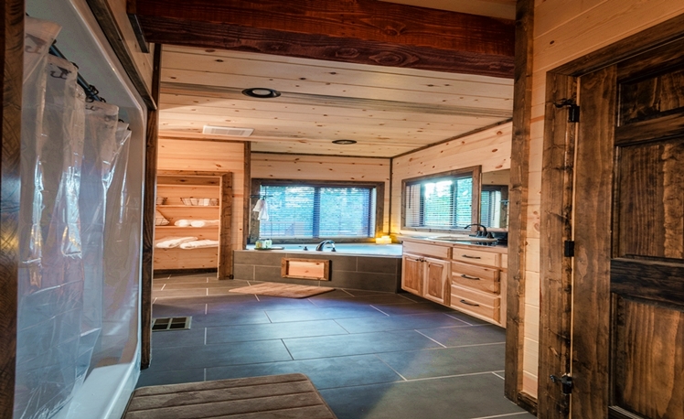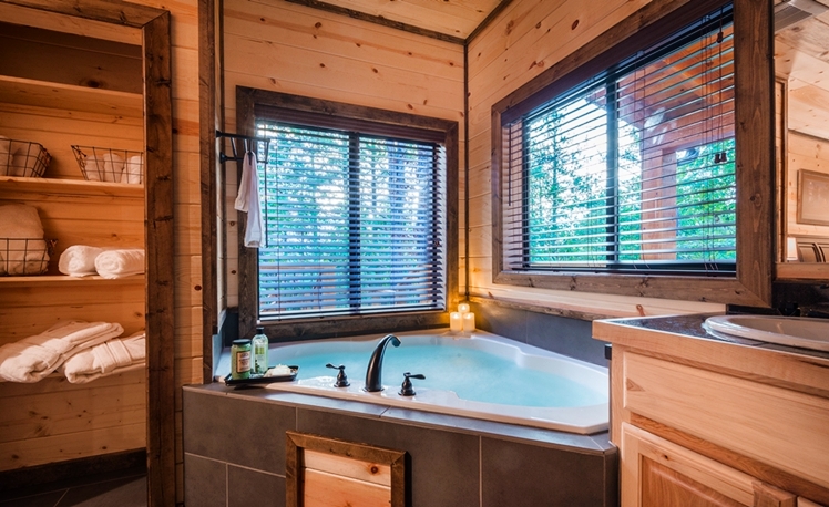Luxurious Mountain Spa Cabin (Sleeps 6) – Featuring a spectacular mountain ridge view, sitting very high in the trees – overlooking a spring-fed mountain creek. This cabin’s Master Suite is equipped with upscale spa amenities, including a wet steam room with shower and a 2-person Jacuzzi hot-air bath. The overlooking elevated deck includes a hot tub, TV, wood-burning fireplace, outdoor dining table and seating. Enjoy cozy evenings by the firepit, surrounded by the warm glow of string lights, creating the perfect ambiance for relaxation and making memories.