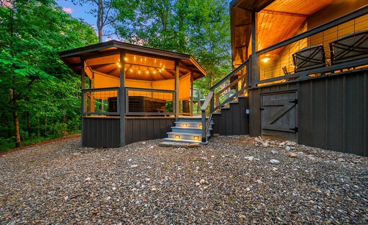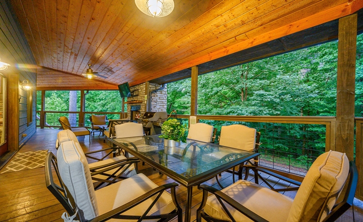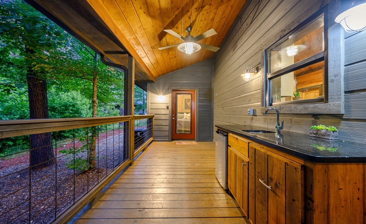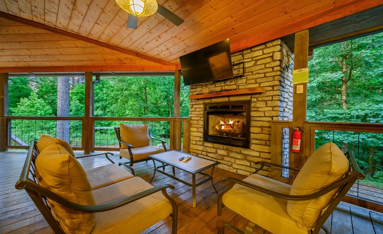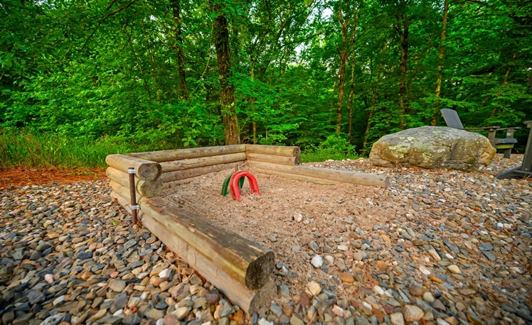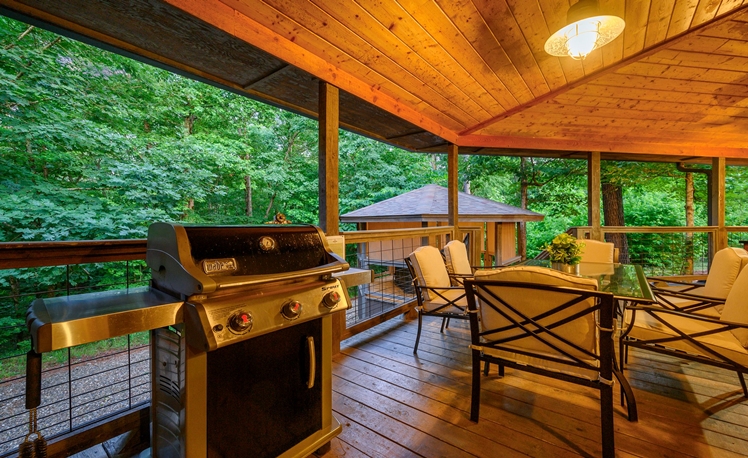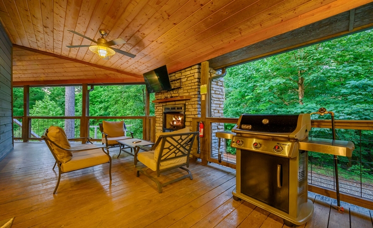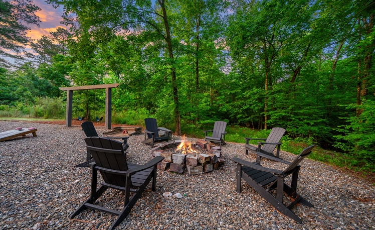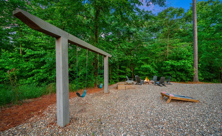 The Outdoor living area includes dining tables, a gas fireplace, a mini refrigerator, a propane grill, a sink, and a food prep area. The dining outdoor tables provide comfortable seating for 10 guests. A fire pit is great for roasting marshmallows and visiting, and a Swing Set for the little ones is in the view from the deck. Also, you may enjoy a fun game of Horseshoes or exploring the creek that runs along the back of the property.