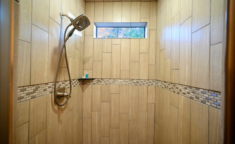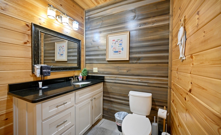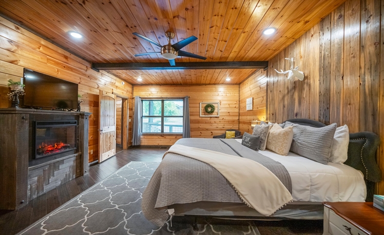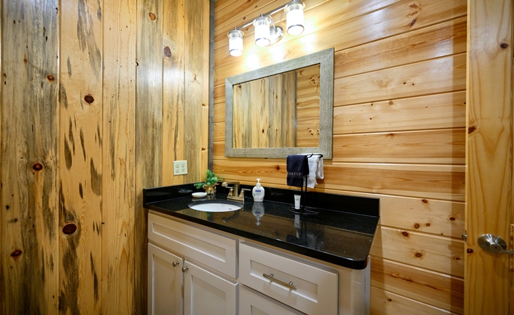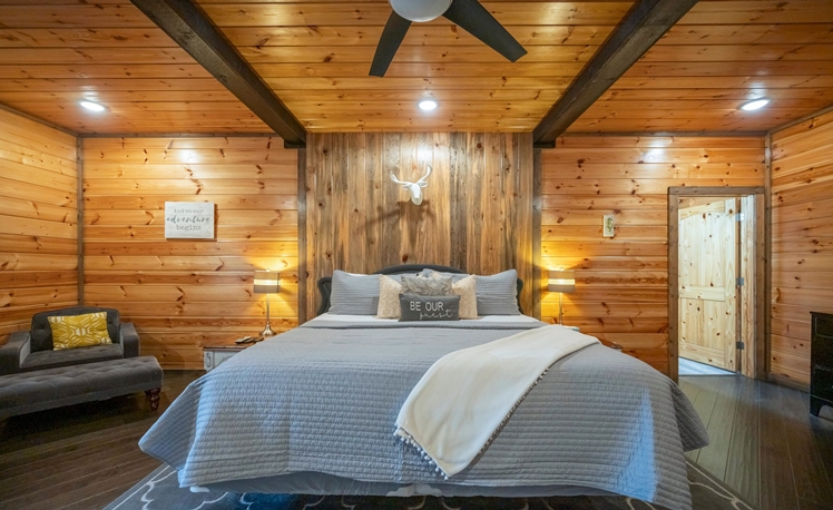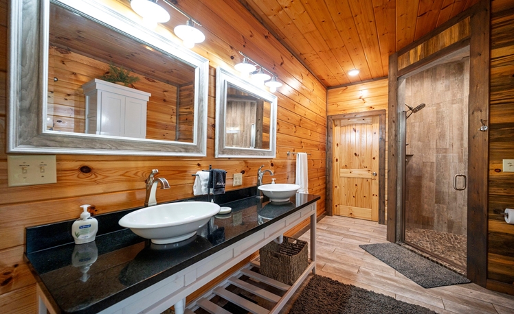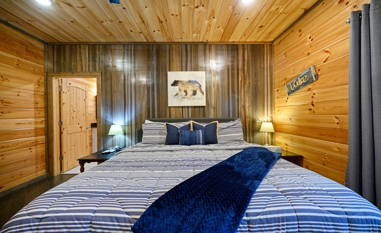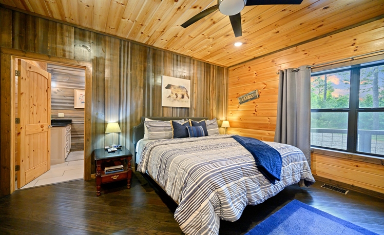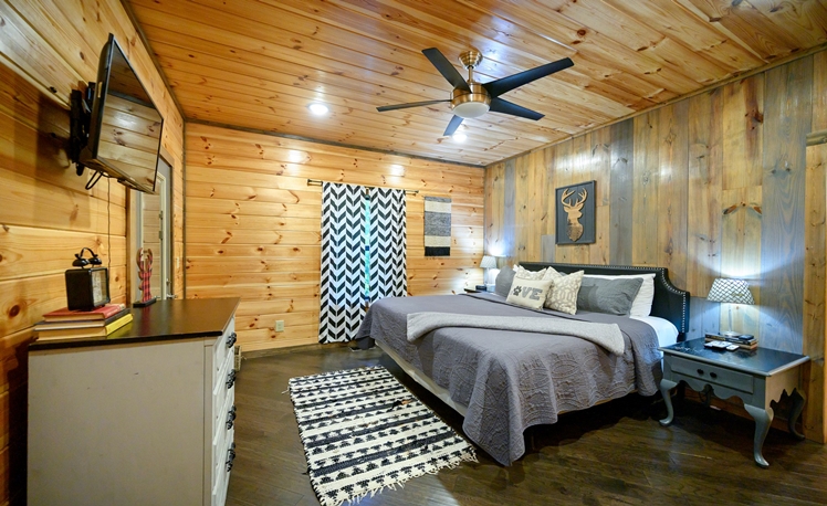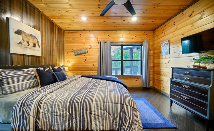 The master bedroom, just off the Great Room, is very spacious with a King bed, fireplace, a 50″ HDTV with DirecTV, and Roku/Internet TV. The en suite bath has a walk-in tile shower, double vanity, and a pedestal soaking tub. The 2nd and 3rd Master Bedrooms bedrooms are also located on the main floor each with a king-size bed, 43″ HDTV with DirecTV, and Roku/Internet TV. Both bedrooms have attached baths with a walk-in tiled shower and a single vanity.