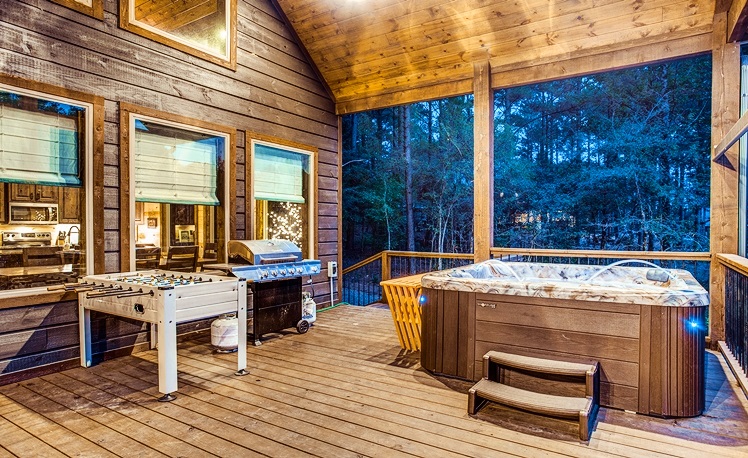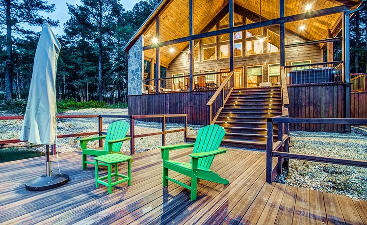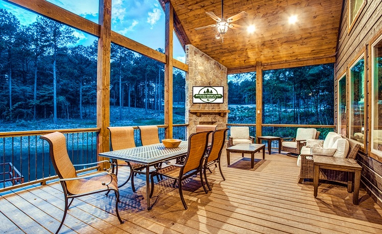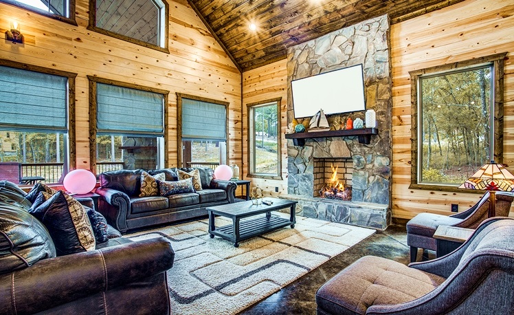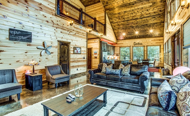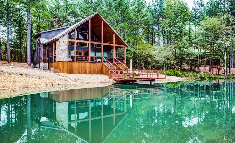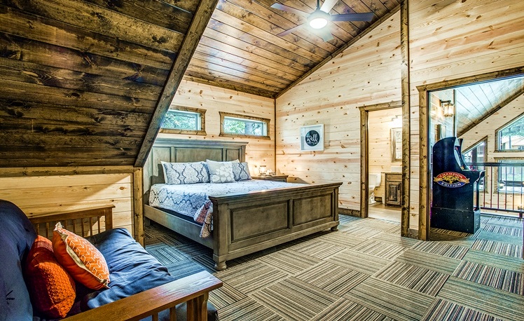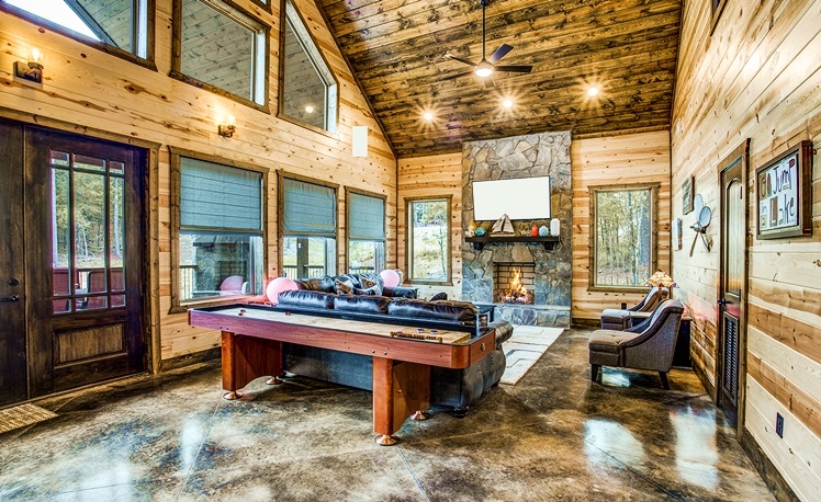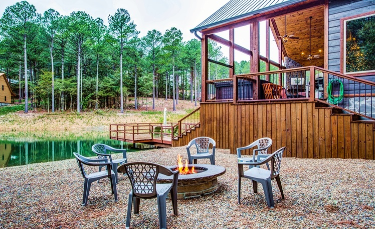 Family/Group Cabin on the Water | 4 Masters | Private Pier on Pond | Fishing in Pond | Pet Friendly (small pets) | Outdoor Living Area with Fireplace and TV | Games – Shuffleboard, Foosball, and Arcade!