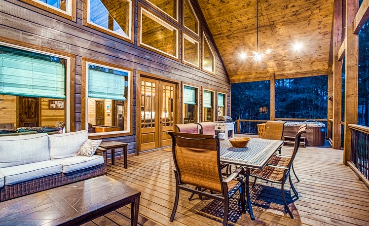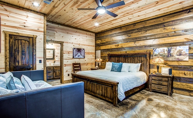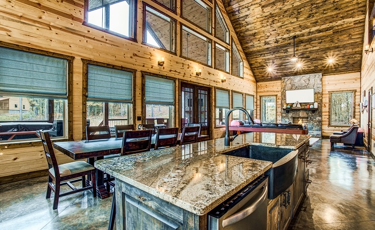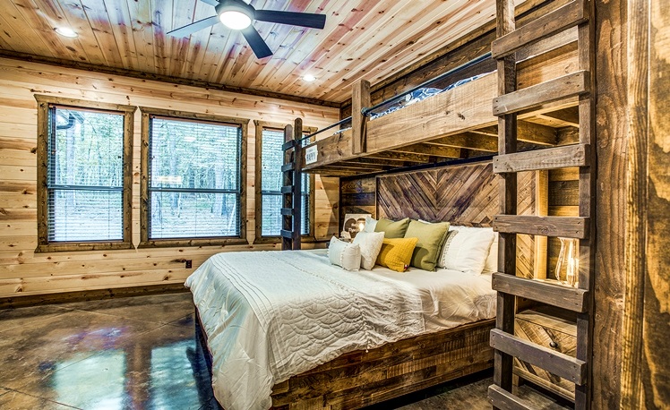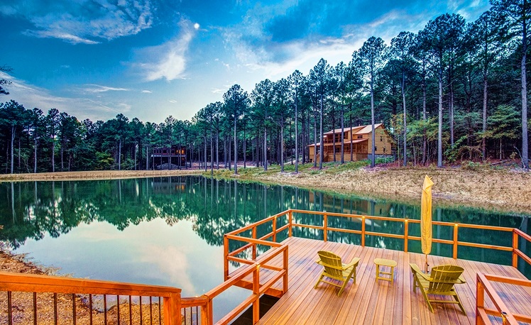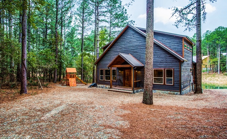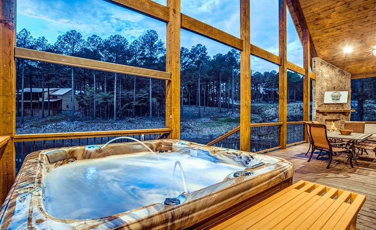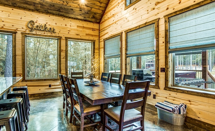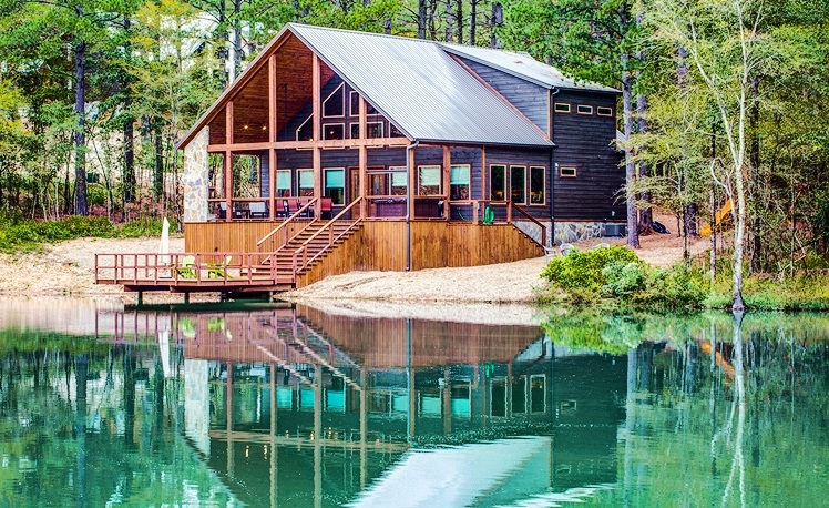 Family/Group Cabin on the Water | 4 Masters | Private Pier on Pond | Fishing in Pond | Pet Friendly (small pets) | Outdoor Living Area with Fireplace and TV | Games – Shuffleboard, Foosball, and Arcade!