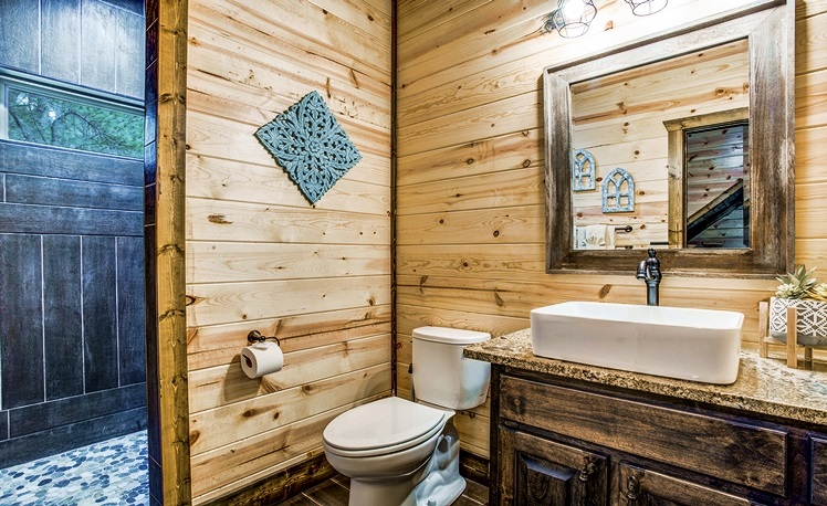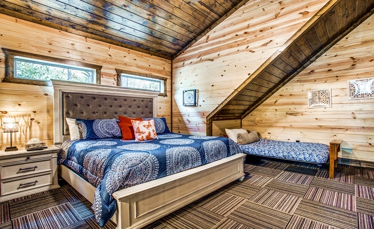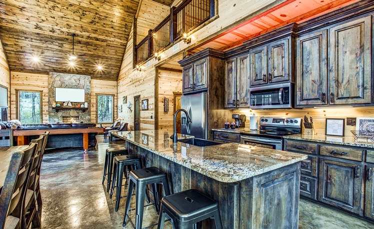 Each floor hosts two Master Bedrooms with king-size beds. Each bedroom has sleeping to accompany children for larger groups. All bedrooms have attached private bathrooms with walk-in tiled showers or a combo tub/shower. The kitchen is fully equipped. The Dining nearby table allows for groups to sit down to dine. The cabinets are stocked with cookware and utensil for cooking. In the living area, one of the sofas converts to a queen sleeper. The HDTV has DirecTV channels.