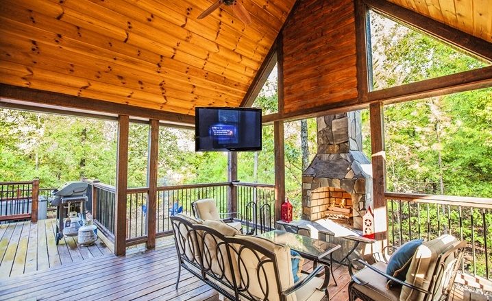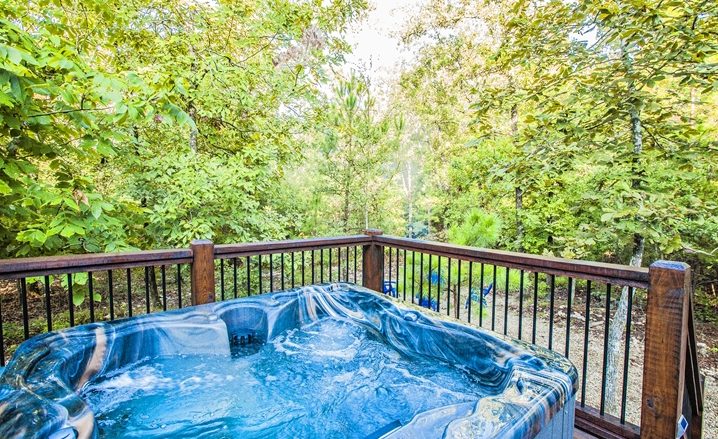 The outdoor areas include a covered porch, located just off the kitchen is a covered deck with a real wood-burning rock fireplace, outdoor TV and very comfortable outdoor seating. In back is a spacious deck with a table (4 comfortable chairs), this area is great for grilling, dining or relaxing. And, you’ll find the 4-person hot tub on its own deck area, which is open to the sky where you can soak and take in the stars or the evening sunsets.