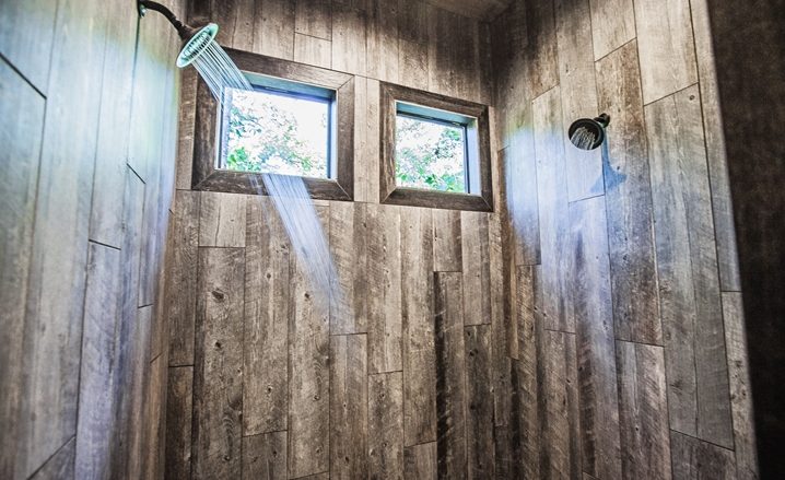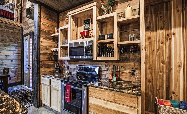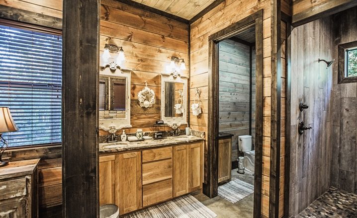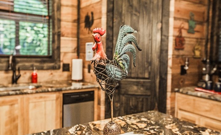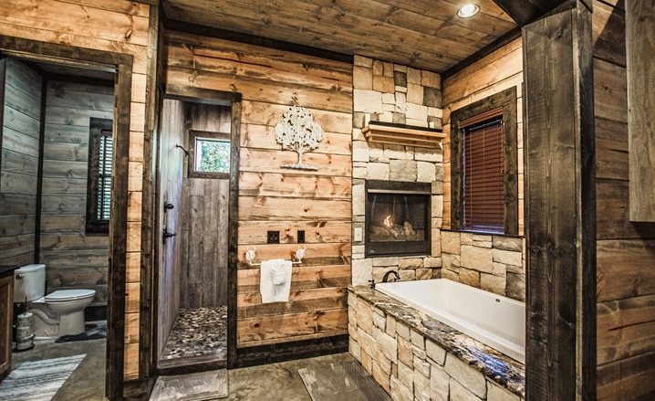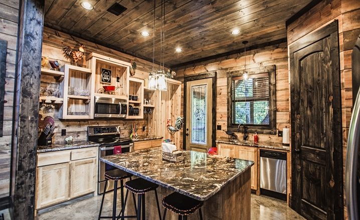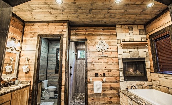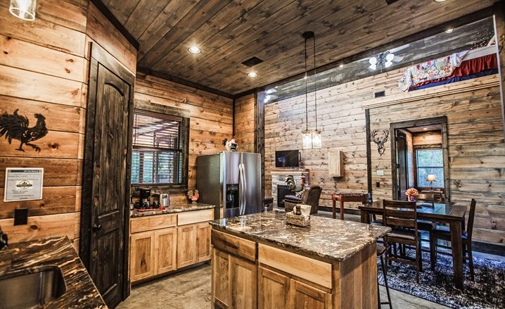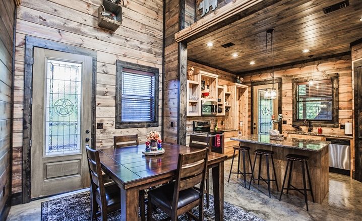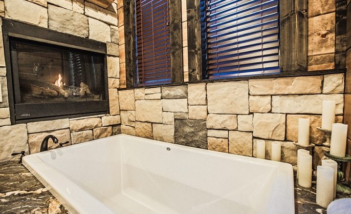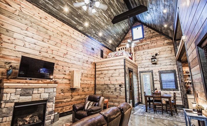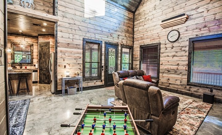 The Off The Record couples’ cabin is eye-grabbing with high vaulted ceilings, high walls and tall doors. The Great Room’s design is similar to a timber frame lodge design – showcased by high-vaulted ceilings, large view windows, with wide-plank walls which are stained with gray/blue wood tones. The floors are stained concrete with several shades of gray and a glossy finish. You will be impressed with the comfortable King Bed. The master bathroom is unique with an elevated bathtub, fireplace and large over-sized Porcelain tile shower. The kitchen features granite counters, and center island (3 stools) along with a pub-style dining table (seats 4). A Foosball table provides fun for everyone.