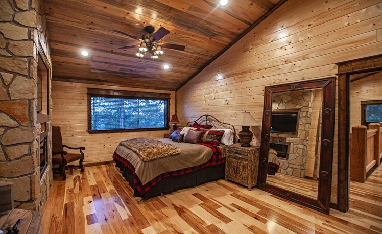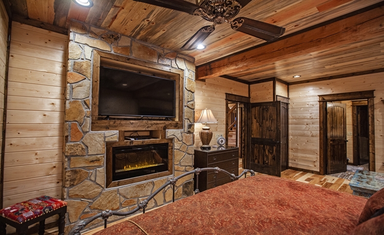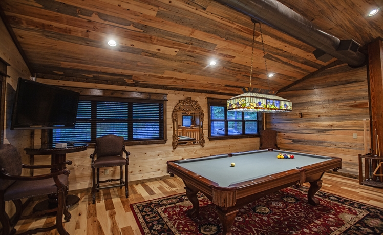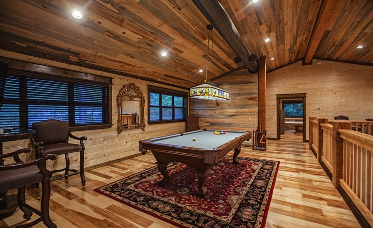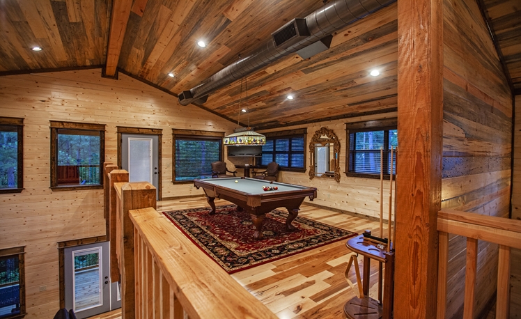 The 2 Master Suites includes King Beds, 55″ TVs, and rock fireplaces. The a Pool Table and adjoining covered balcony to view the Pines from high.