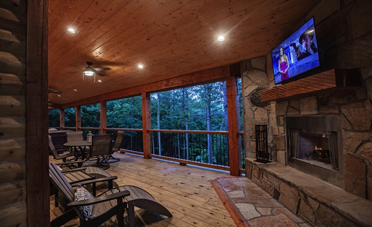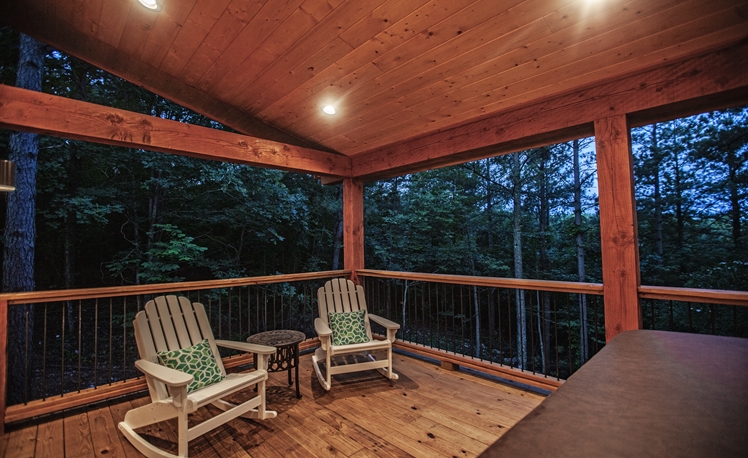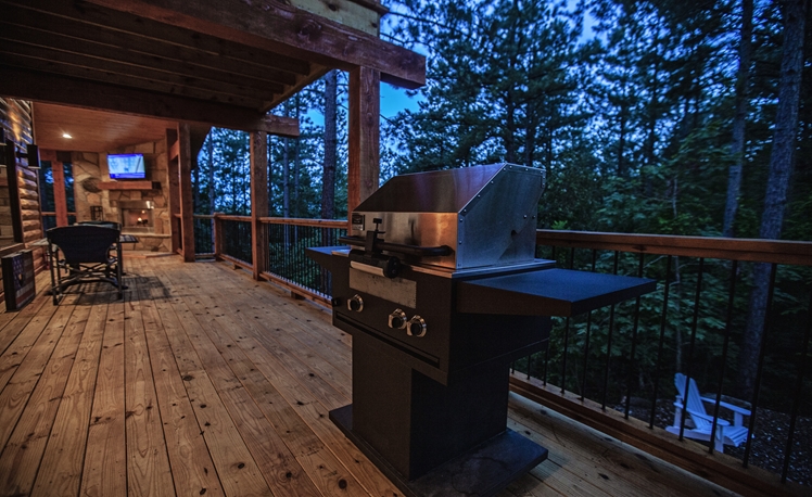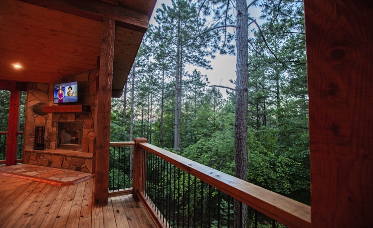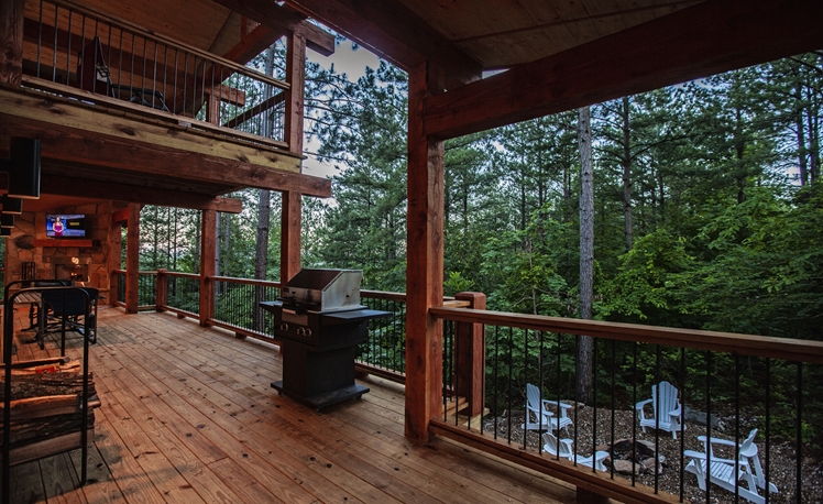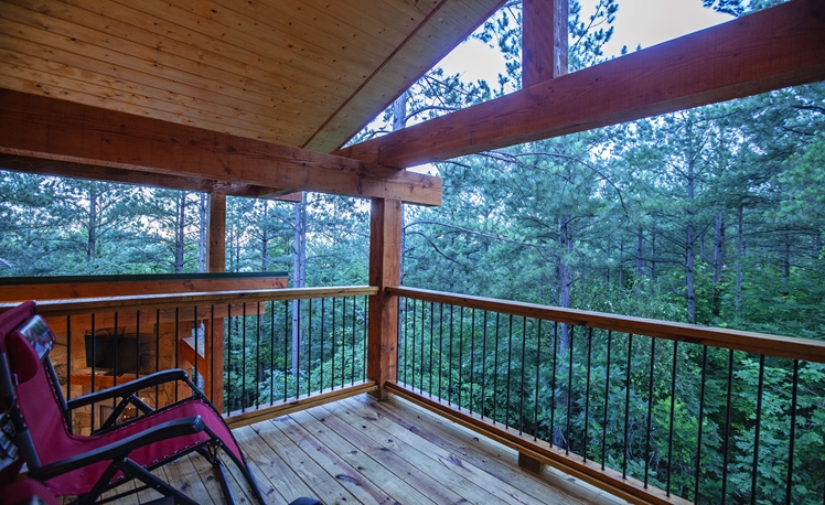 The elevated deck offers scenic mountain ridge views in the hardwoods and Pines.
