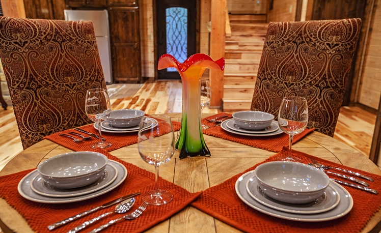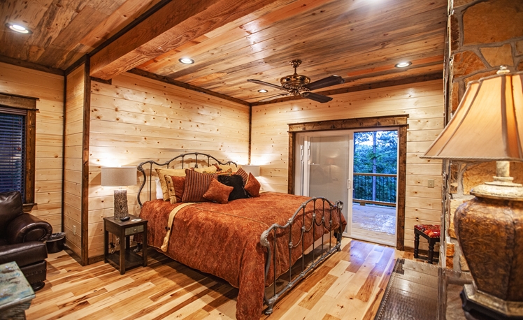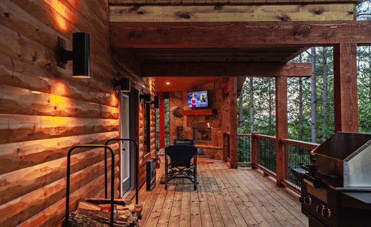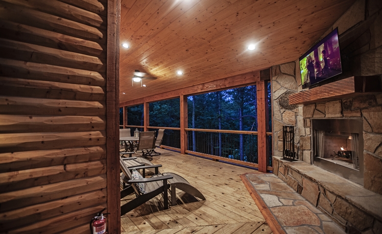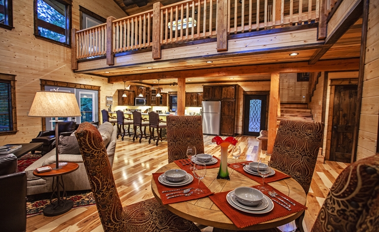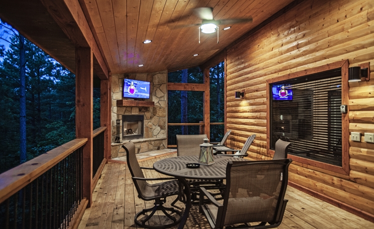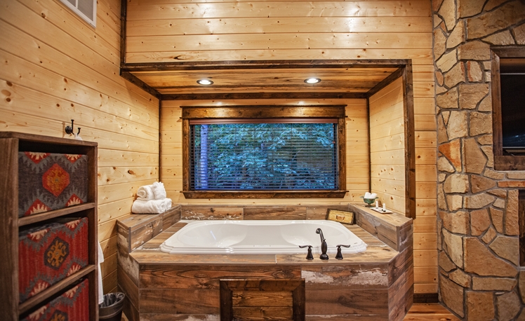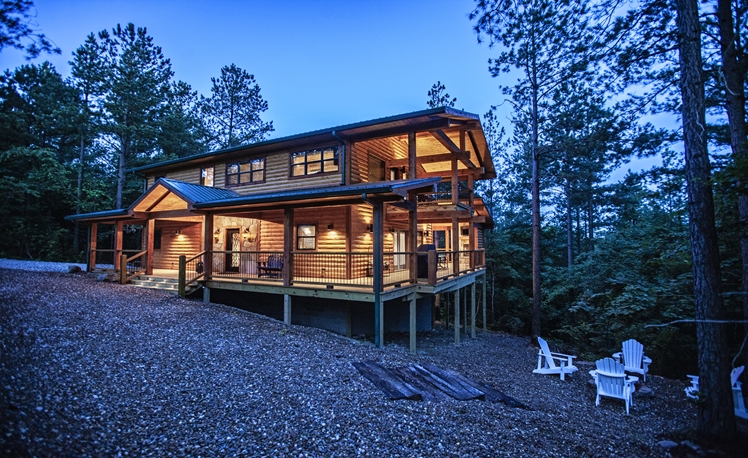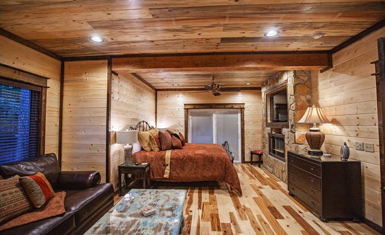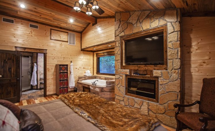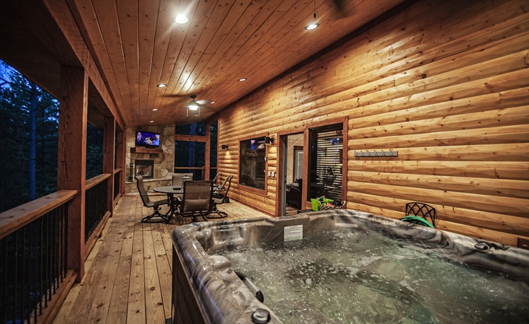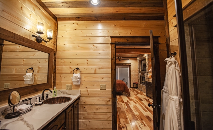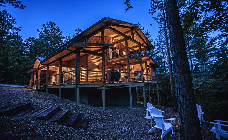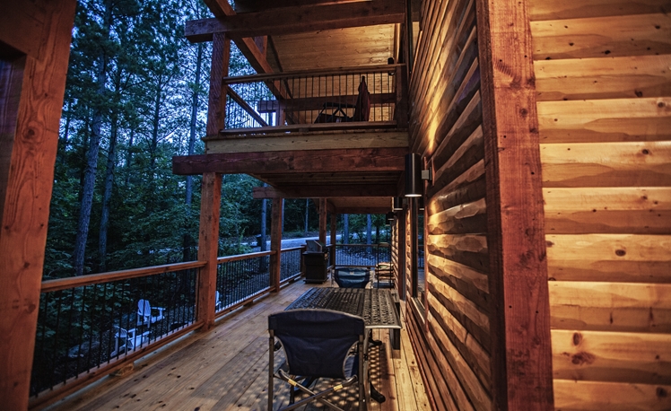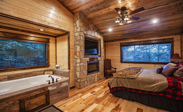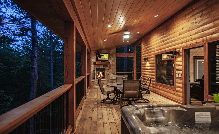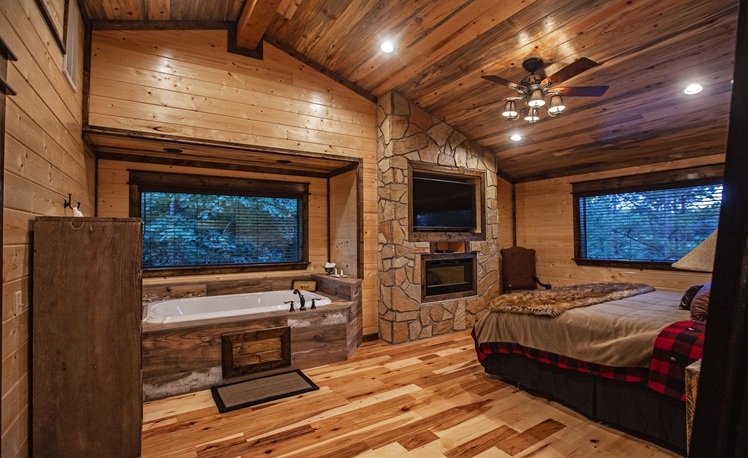 Upscale Mountain Spa Cabin (Sleeps 4) – Featuring a mountain ridge setting overlooking the Pines and Hardwoods. This cabin is equipped with upscale spa amenities, including a wet steam room with shower, and a 2-person Jacuzzi hot-air bath. The overlooking elevated deck includes a hot tub, wood-burning fireplace, TV, outdoor dining table and comfortable seating.