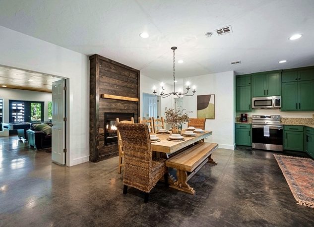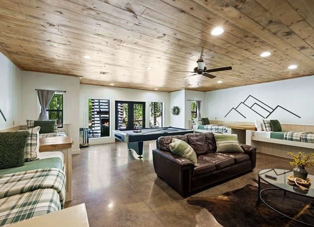 Families or Groups will enjoy gathering dining at the Farmhouse Dining Table, located next to a warm double-sided fireplace. The large Bunk/Game Room amenities include a Pool Table, Pac-Man Arcade Game, Comfortable Seating, Gas Fireplace, and TV. The attached bathroom includes a vessel sink vanity, a full-sized washer/dryer, and French doors leading to the 2 outdoor patios.