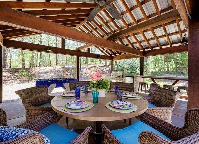 • Outdoor Fireplace, TV, Furniture, Gas Grill, and Dining Table