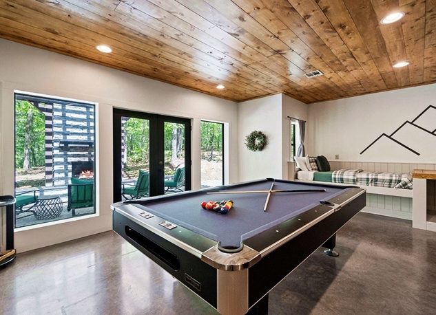 Modern Cabin | 2+ Bedrooms | 1.7 Wooded Acres | Sleeps 8 | Families or Couples | 2.5 Baths | 2 Masters | Bunk/Game Room | Patio – Large Pergola | Outdoor Furniture | Pet Friendly | Pool Table | Pac-Man Arcade Game | Cornhole and Foosball Games | 2-Sided Gas Fireplace | Outdoor Wood Burning Fireplace | Hot Tub | Outdoor TV