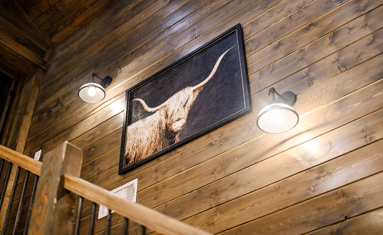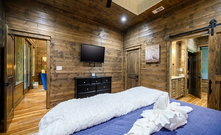 The Sleepy Fox’s kitchen is adorned with sleek stainless-steel appliances, a 4-Seat Dining Table and a kitchen island with 4 bar stools. Step outside onto the spacious deck and be greeted by outdoor dining table, outdoor fireplace, where you can gather around with loved ones and share stories under the starlit sky. Take a dip in the bubbling hot tub or catch up on your favorite shows on the outdoor TV while lounging in the comfortable seating area.
