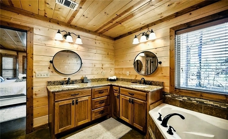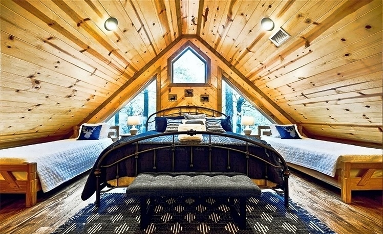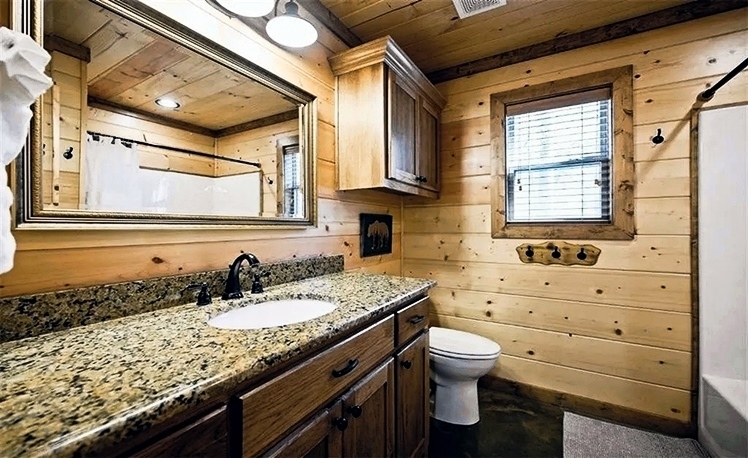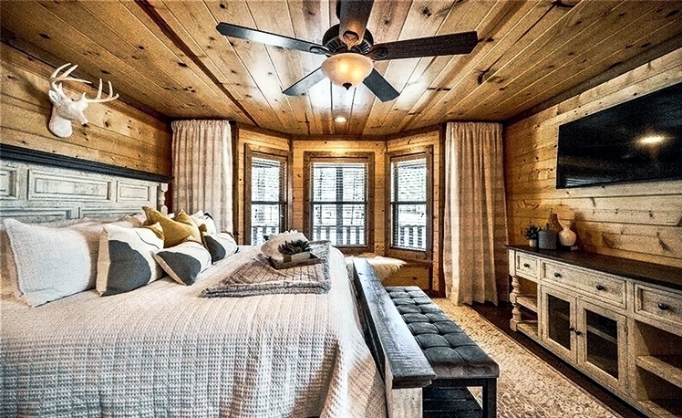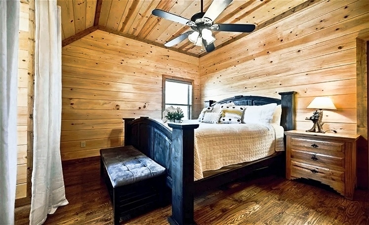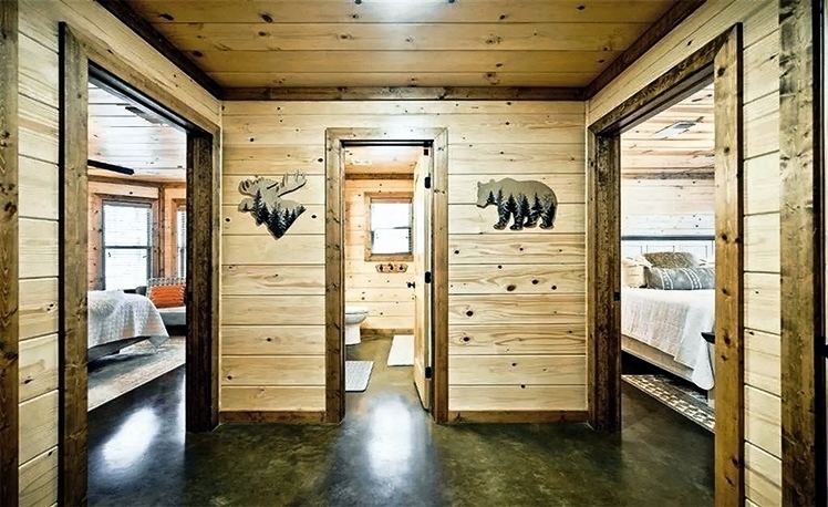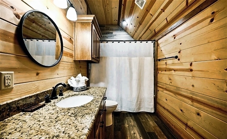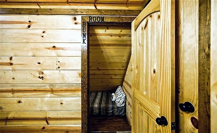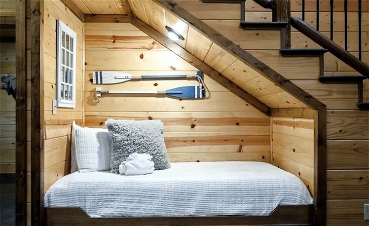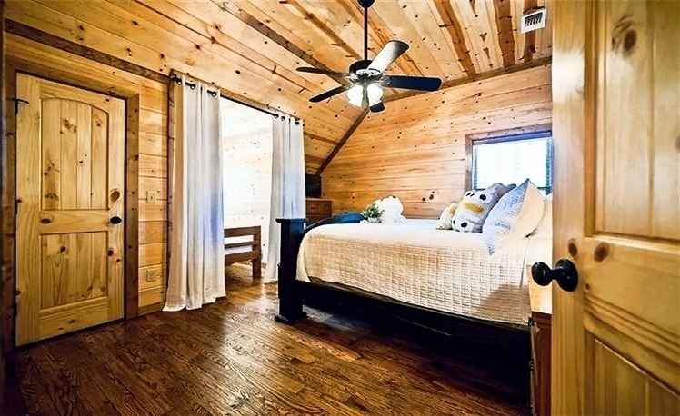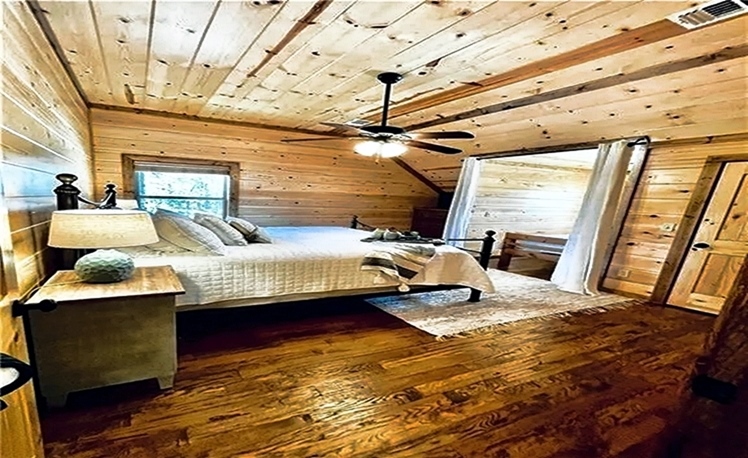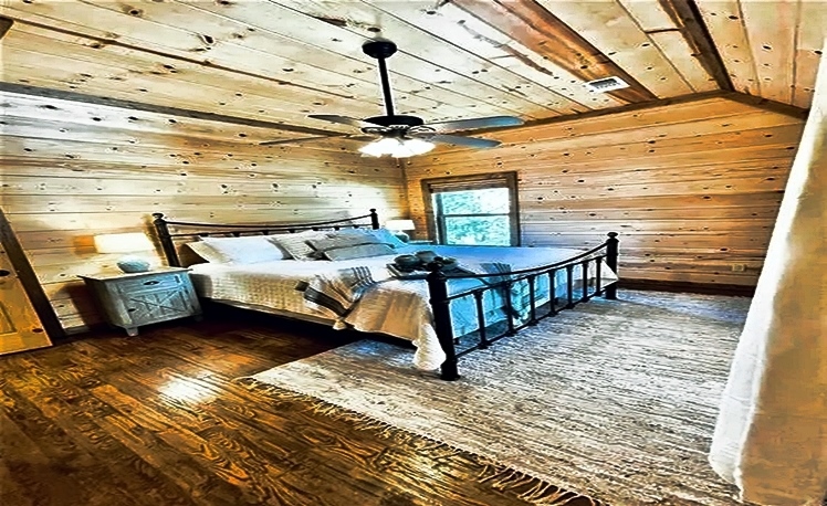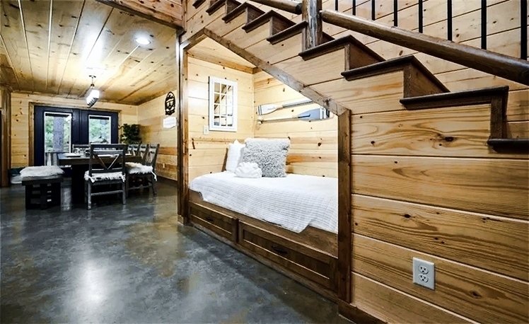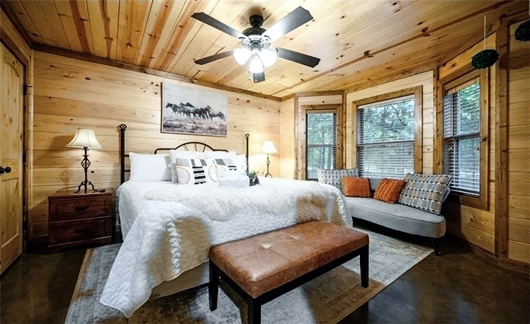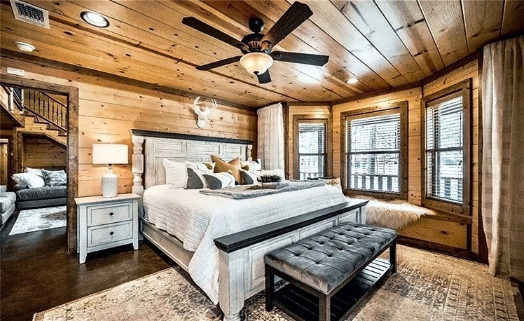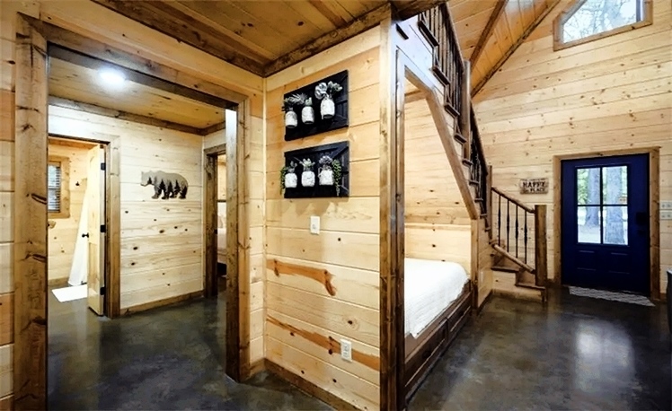 There are 3 first-floor king bedrooms which accompany the living space on either side, one being a master bedroom with a full tub and tiled shower in the master bathroom. Also, downstairs is an extra built-in bunk bed under the stairs.