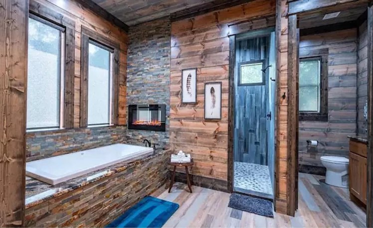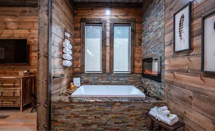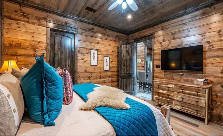 As you enter the cabin, you will notice a stunning Great Room, with vaulted ceilings, large view windows and a massive stone electric (LED) fireplace. The Great Room flows into the grand Master Bedroom and continues with a luxurious master bath with tub-level fireplace.  The rich wood tones continue with a king size bed and TV. The master bathroom features a double vanity, a large walk-in shower and soaking tub.