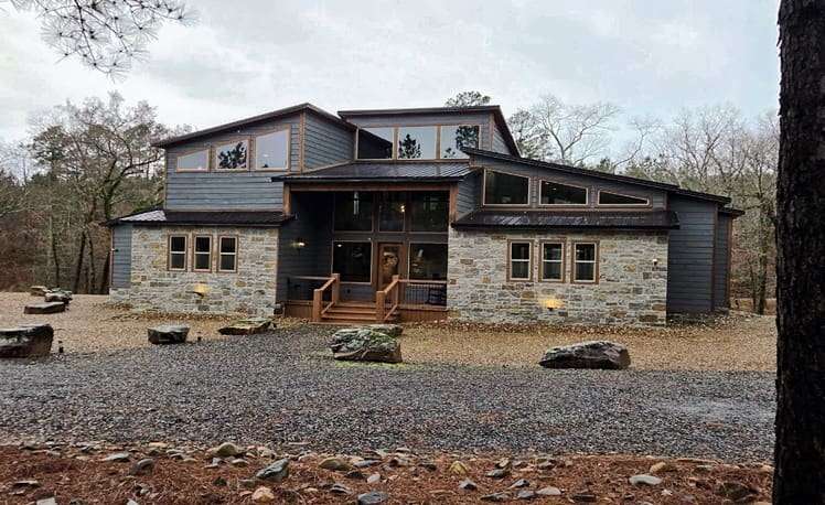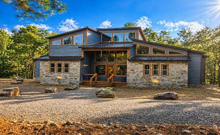 The Whippoorwill Cabin offers 5 Bedrooms and 5.5 Bathrooms, accommodating 17 guests with a living space of 3,775 sq. ft. The mountain creek and overlooking rock ledges provide a perfect nature landscape view.