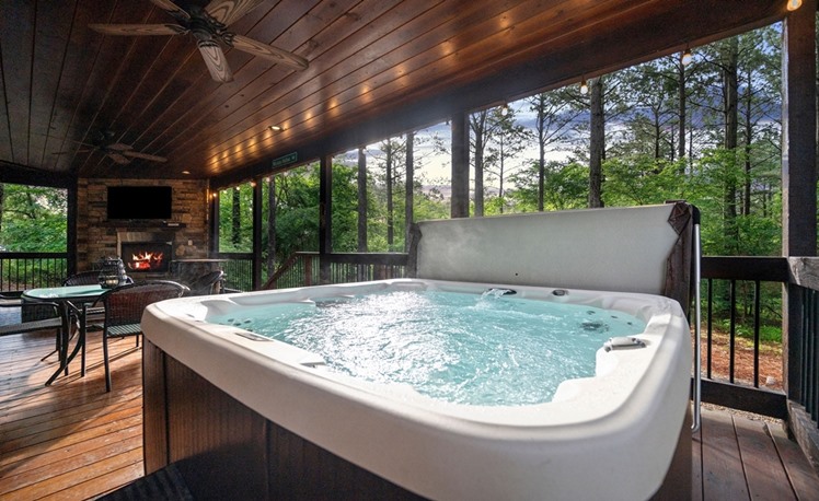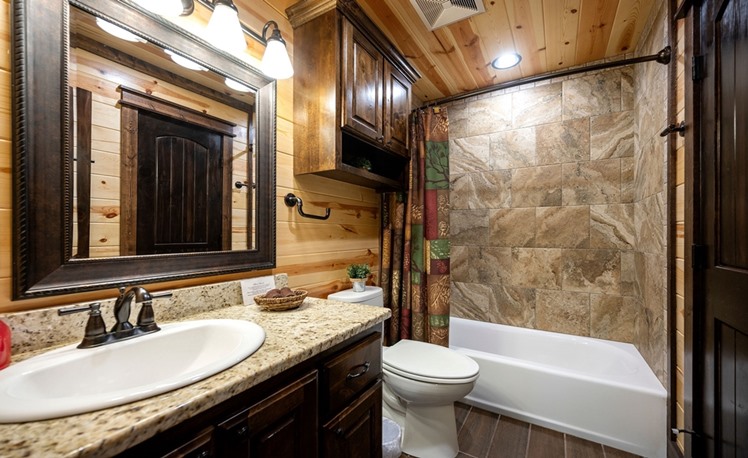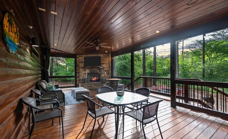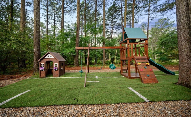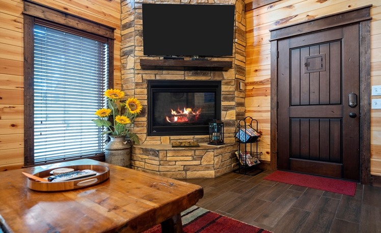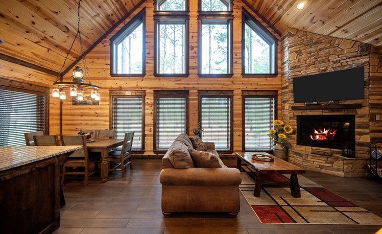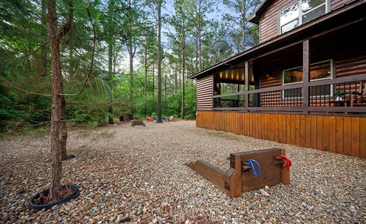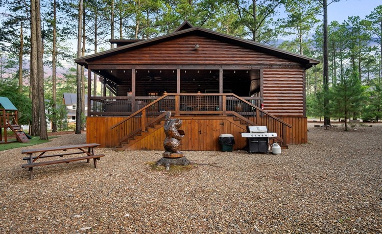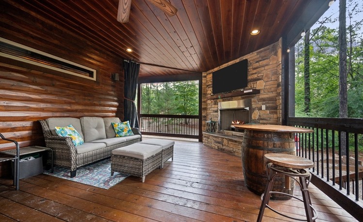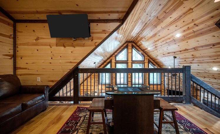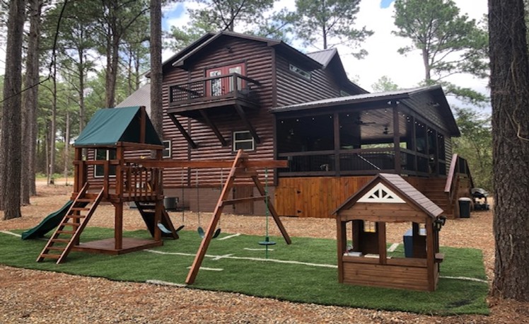The outside patio boasts over 700 sq ft of entertainment pleasure! Kick back on the 14ft wide covered back deck set for outdoor dining and fellowship. Relax in the 6-8 person Hot Tub, stay cozy near the gas fireplace, and never miss a show on the 60″ Samsung Flat Screen TV with Entertainment DirecTV programming. The newest Cabin has a little bit of everything for the whole family, including a Playground Fort, Outdoor Playhouse, Horseshoe Pit, Ladder Golf, Corn Hole, and Much more!