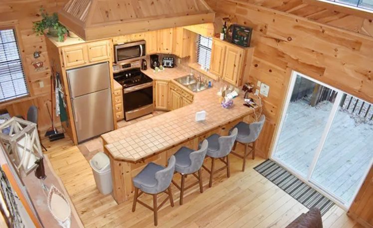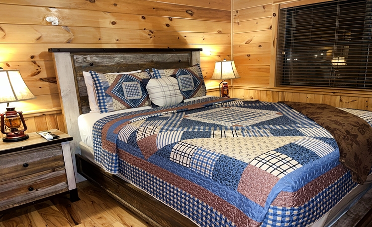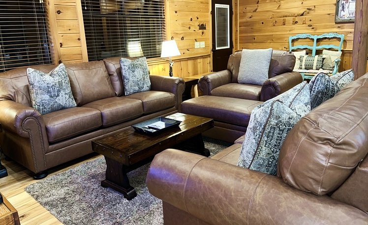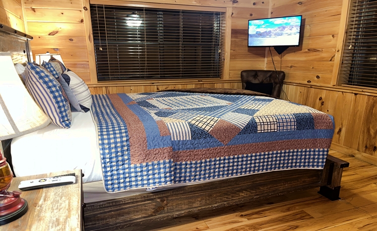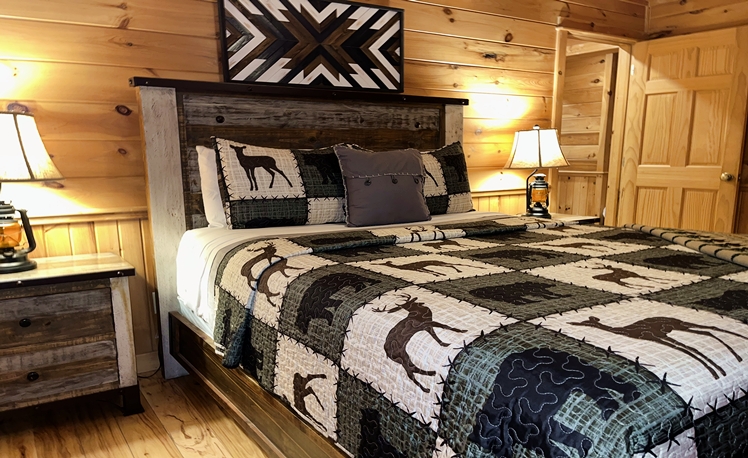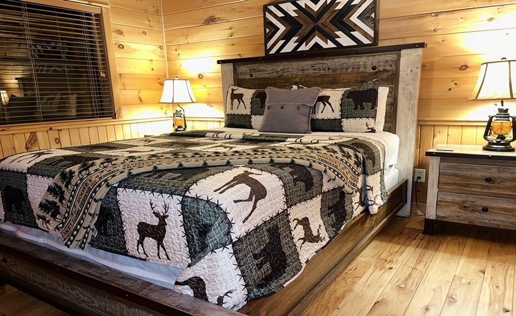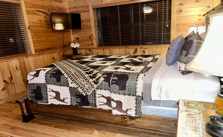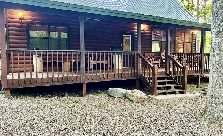 The Great Room includes a large 47-inch High-Definition TV and a full-sized fully equipped kitchen. After the sun sets, build a fire in the wood burning fireplace and enjoy the rustic appeal and warmth of the Great Room.  The outside area is framed by an 8 x 40 full front porch and a 12 x 30 back deck. For those who can’t go a night without delicious Smores, light a nice campfire and start a game of horseshoes.