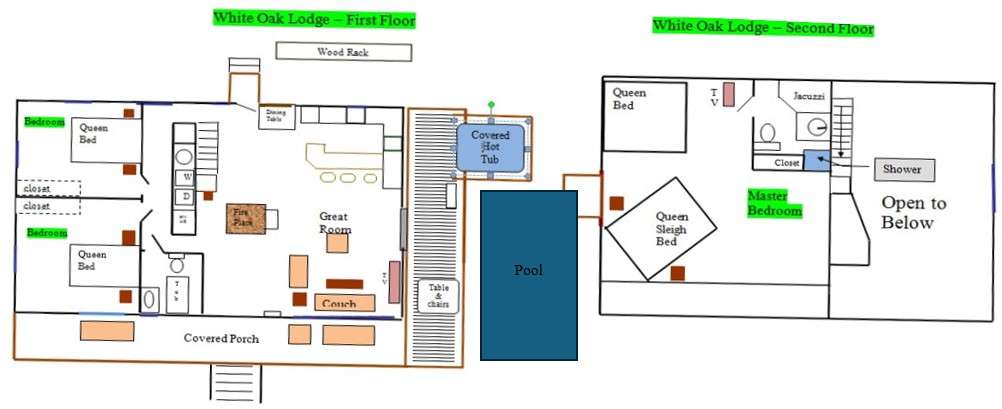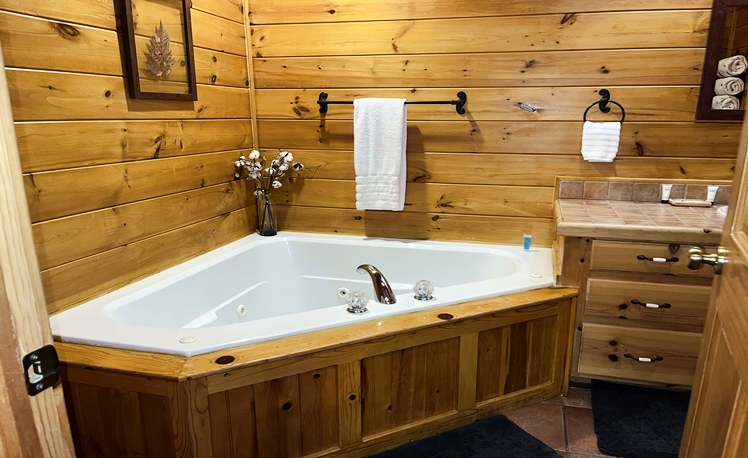 The cabin itself offers plenty of room, with three bedrooms and two baths within approximately 1,800 square feet. Let the kids bring their friends – the cabin accommodates up to 8 people comfortably. White Oak Lodge includes 3 Bedrooms each with TV and comfortable beds. Outside on the wrap around deck is a large covered hot tub.