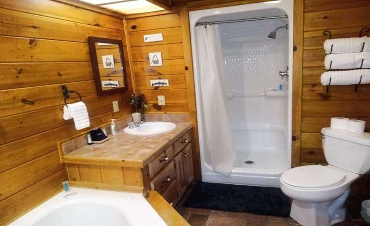 Inside, the cabin offers classic cabin charm with a rock wood-burning fireplace, a unique semi-circular staircase, and a comfortable two-level layout. The upstairs master suite includes a private ensuite with a jacuzzi tub and a separate shower. Downstairs, you’ll find two queen bedrooms and a full bath, making the layout a great fit for families or small groups.